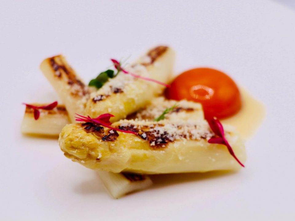 Espárragos asados, praliné de avellanas y yema de huevo curada
